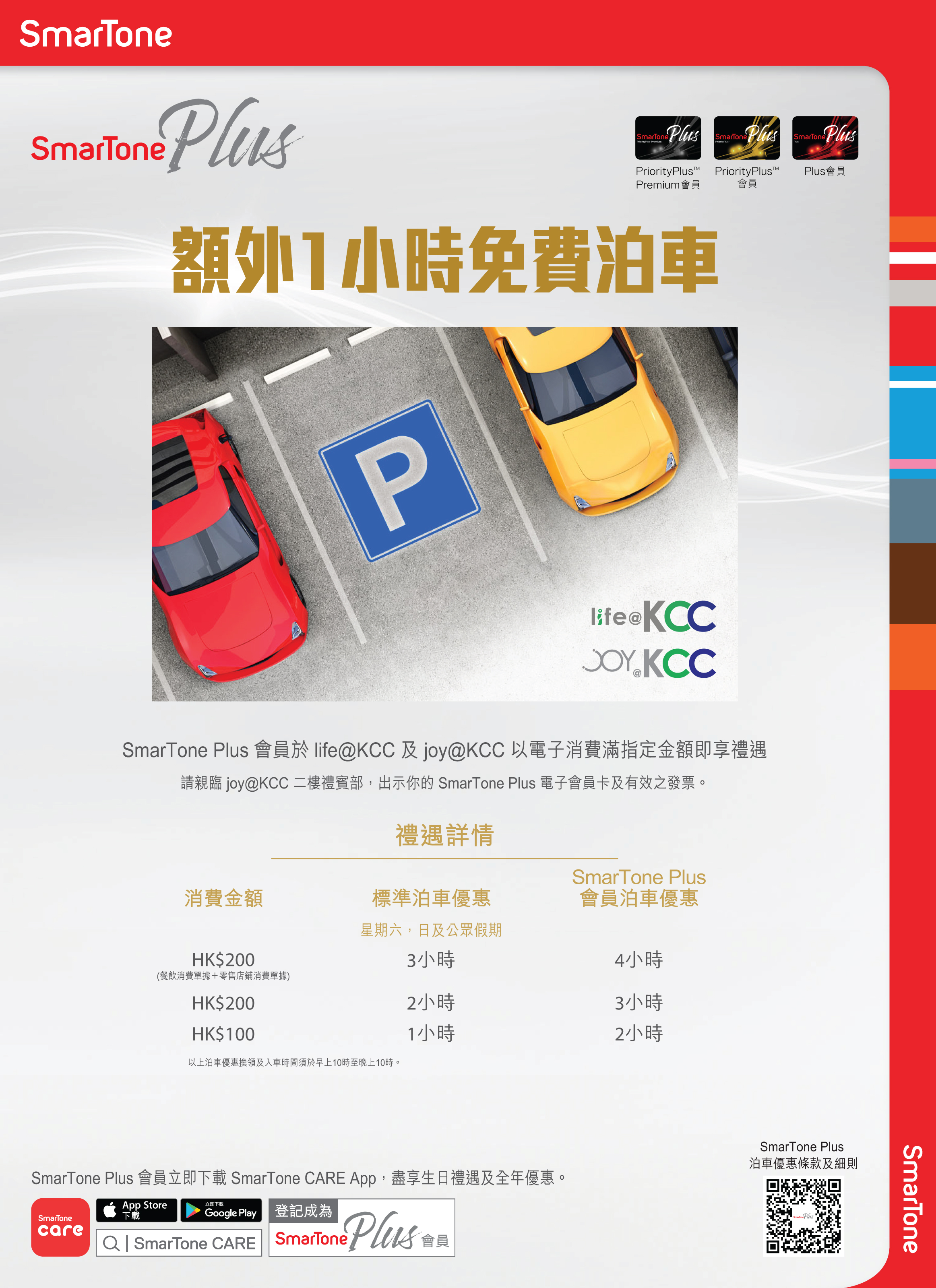 泊車 泊車優惠 免費泊車優惠推廣 顧客於場內消費指定金額,即可享免費泊車優惠 標準收費 每小時 星期一至星期五 $27 星期六、日及公眾假期 $23 顧客凡於本商場消費滿以上指定金額(最多累積2張不同商戶的即日機印發票,每張單據須滿$100或以上),即可於二樓’顧客服務中心’辨理換領免費泊車優惠。 有關免費泊車優惠詳情,請往顧客服務中心查詢。